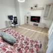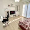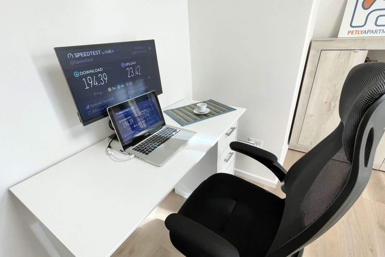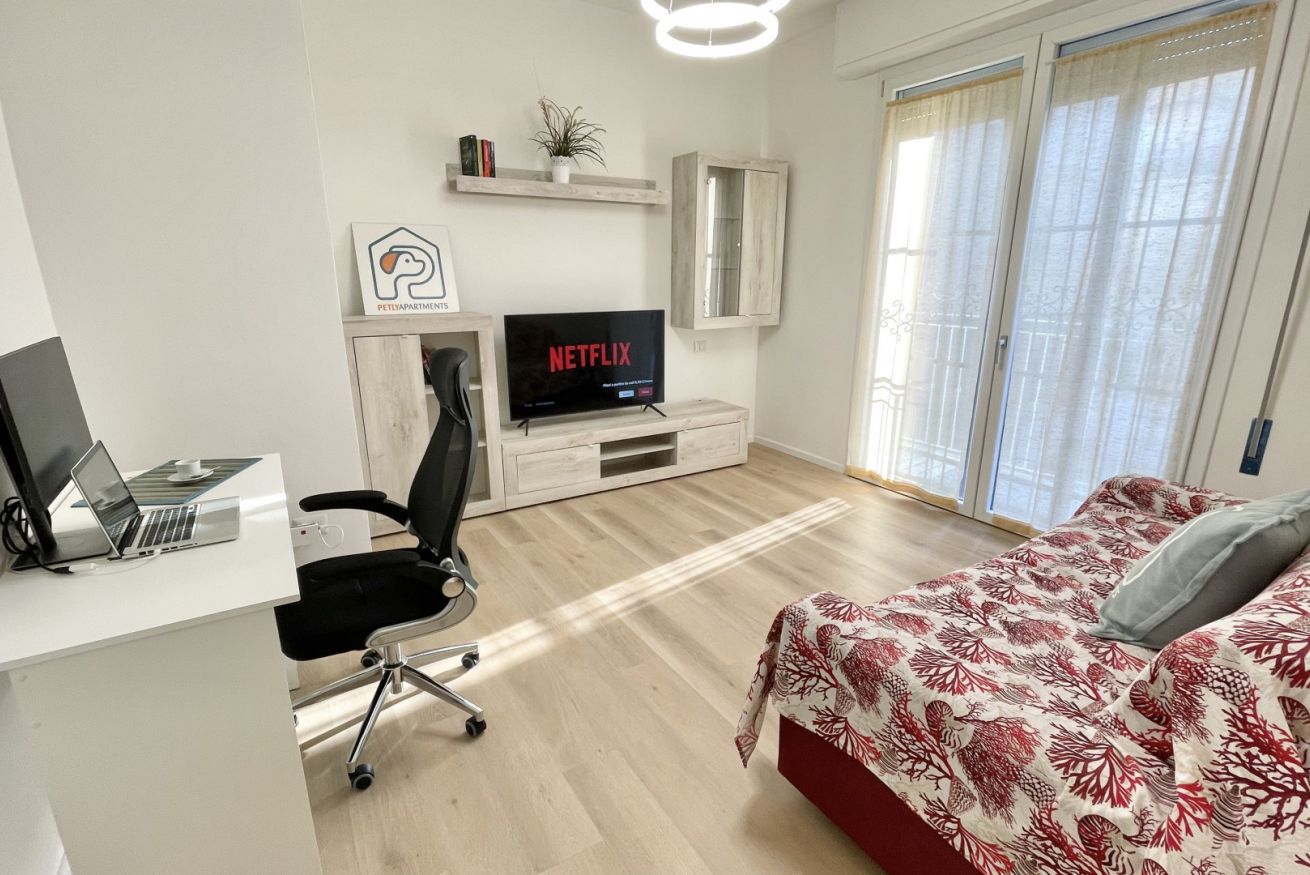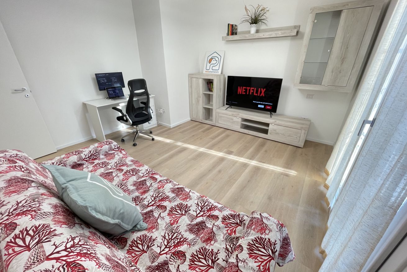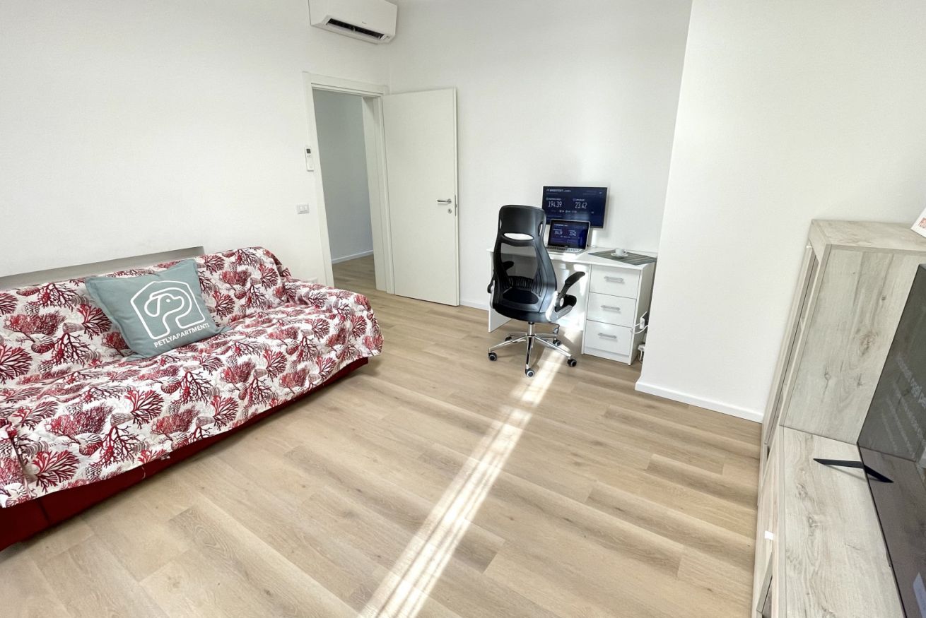 Il soggiorno è il vero cuore pulsante dell'appartamento, con una grande smart TV per goderti i tuoi programmi preferiti. Ma non solo - qui troverai anche una comoda postazione di lavoro, perfetta per gli smartworker in cerca di un'oasi di tranquillità. E quando servono ulteriori posti letto, il divano letto matrimoniale si trasforma in una terza camera da letto, offrendo spazio per tutta la famiglia o gli amici.